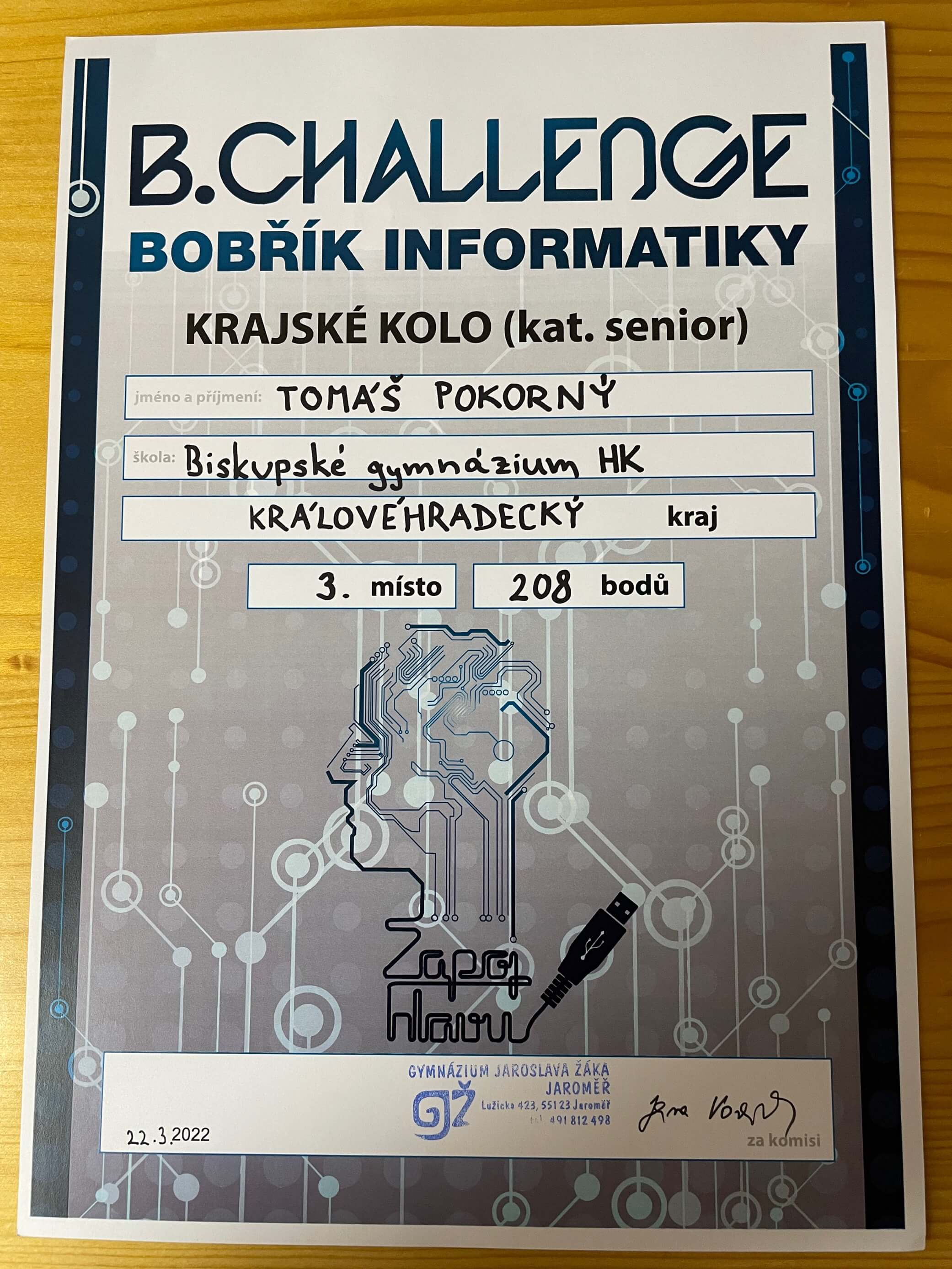 Minulý týden se zúčastnili postupující studenti septim a oktáv krajského kola informatické soutěže Bobřík informatiky – iBobr v Jaroměři. Gratulujeme zejména Tomáši Pokornému, který se umístil na krásném třetím místě! Mezi deseti nejlepšími měla naše škola dokonce čtyřnásobné zastoupení.
