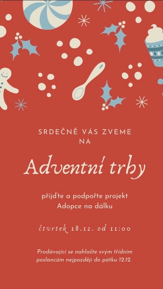 Tradiční Adventní trhy se blíží. Prosíme všechny, kteří chtějí prodávat, aby se nahlásili do pátku 12. 12. svým třídním poslancům.