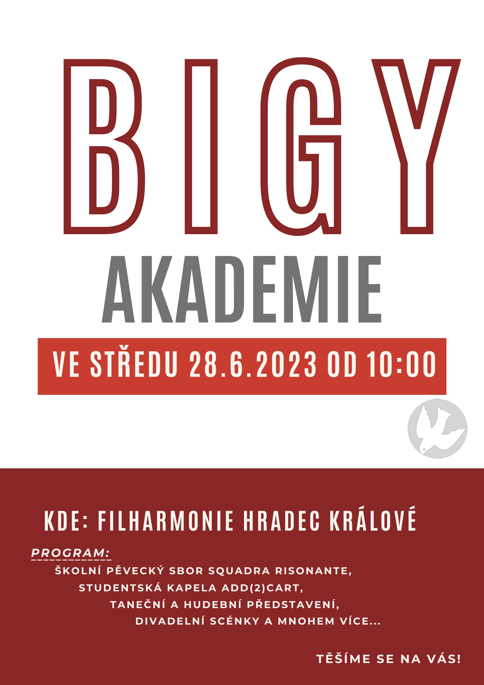 Srdečně zveme všechny studenty, rodiče a přátele školy na Akademii BIGY, která se uskuteční v budově Filharmonie Hradec Králové ve středu 28. 6. 2023 od 10 hodin. Kromě pestrého kulturního programu v režii našich tříd zde budou předána ocenění vybraným studentům za mimořádné úspěchy v tomto školním roce.
