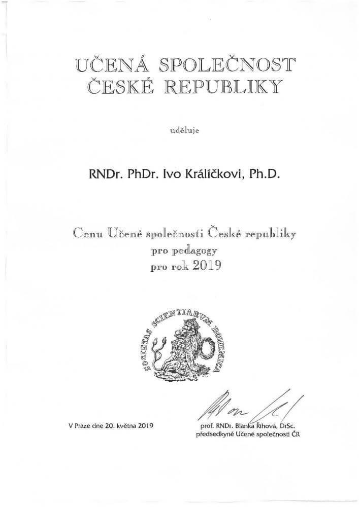Gratulujeme našemu milému a váženému kolegovi Ivo Králíčkovi k Ceně Učené společnosti ČR pro pedagogy pro rok 2019, kterou převzal dne 20.5.2019 ve Velké aule Karolina. Přejeme mnoho dalších pedagogických, vědeckých a osobních úspěchů!
