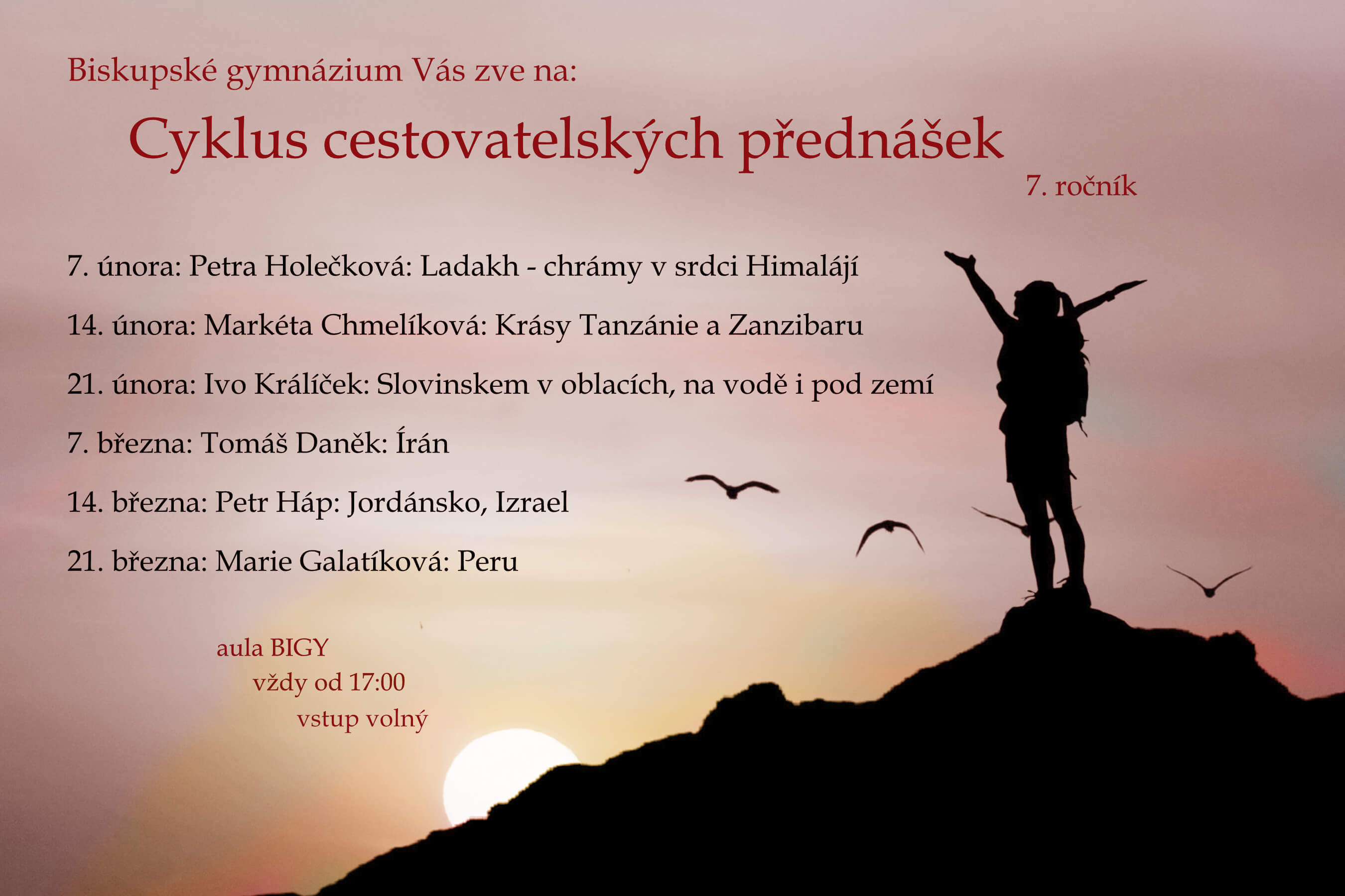 Srdečně Vás zveme na již sedmý ročník našich cestovatelských přednášek. Jednotlivá povídání budou opět probíhat v aule BIGY, vždy ve čtvrtek od 17 hodin. Vstup volný.