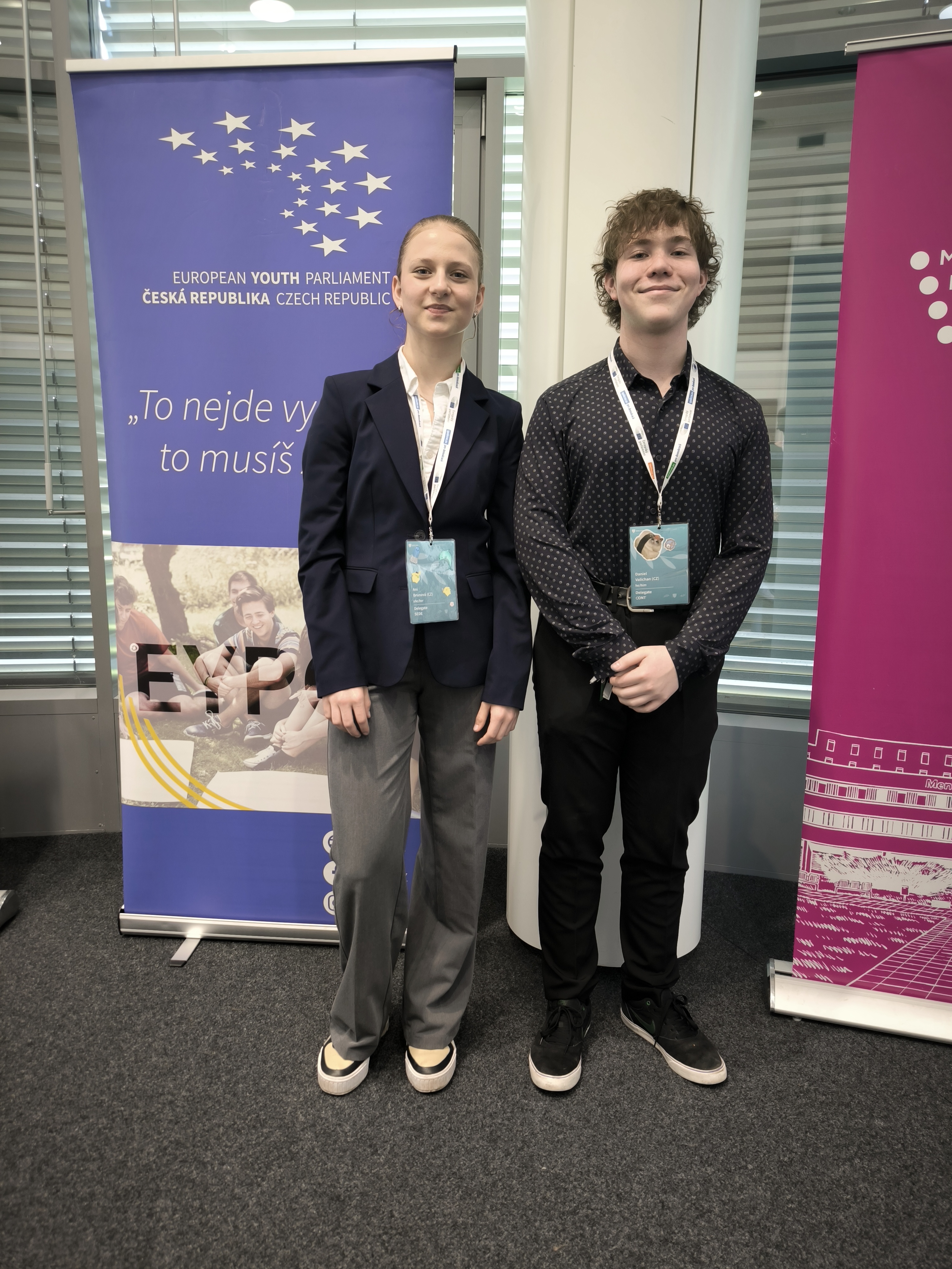 Na letošní Národní výběrové konferenci Evropského parlamentu mládeže, která se uskutečnila 19. - 22. 3. v Brně, reprezentovali naši školu Anička Brunová a Daniel Valichan. Účast si zajistili svými výkony na předchozí regionální konferenci a svou schopnost debatovat v angličtině na nejrůznější složitá politická i ekonomická témata či vystoupit s příspěvkem před zaplněným sálem si teď ověřili mezi stovkou delegátů z celé republiky i zahraničí. Ve velké konkurenci svých vrstevníků se ani tentokrát neztratili. Díky Valče Šubrtové a Hance Flašarové jsme měli letos výrazné zastoupení i mezi organizátory konference.