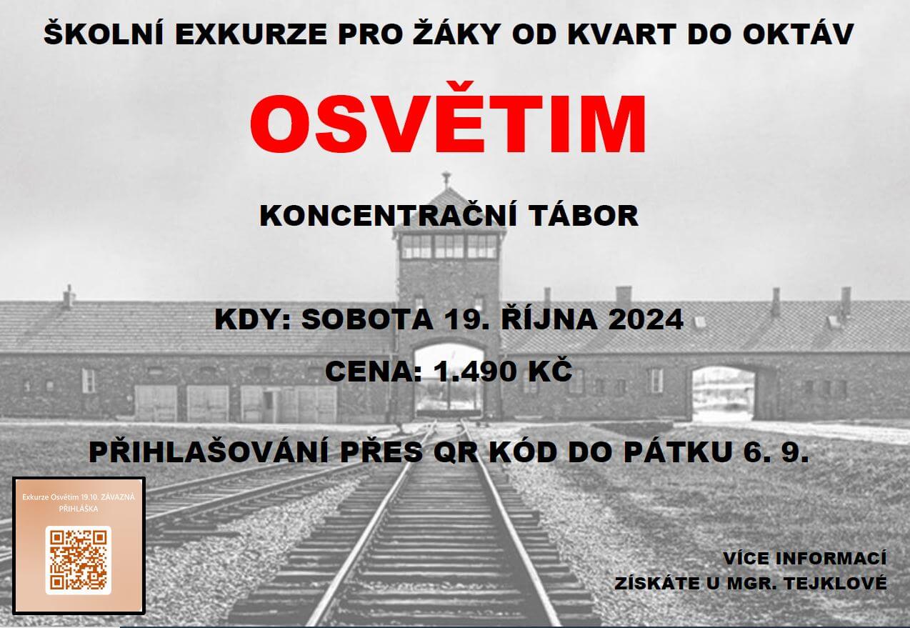 Studentům vyššího gymnázia a kvart nabízíme možnost navštívit v sobotu 19. 10. Osvětim v rámci školní exkurze. Více informací poskytne zájemcům Mgr. Marcela Tejklová, uzavírka přihlášek je již tento pátek 6. 9.!