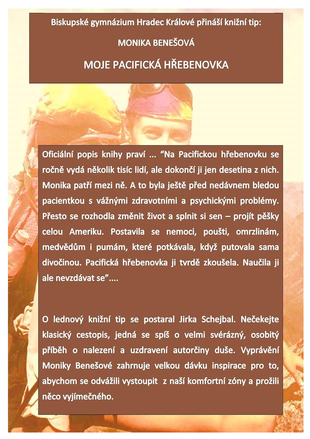 Rozšiřujeme nabídku školní knihovny. Každý měsíc bude doporučen jeden titul, který si budete moci zapůjčit ve školní knihovně. O lednový tip se postaral Jiří Schejbal, který vybral knihu Moniky Benešové Moje Pacifická hřebenovka.