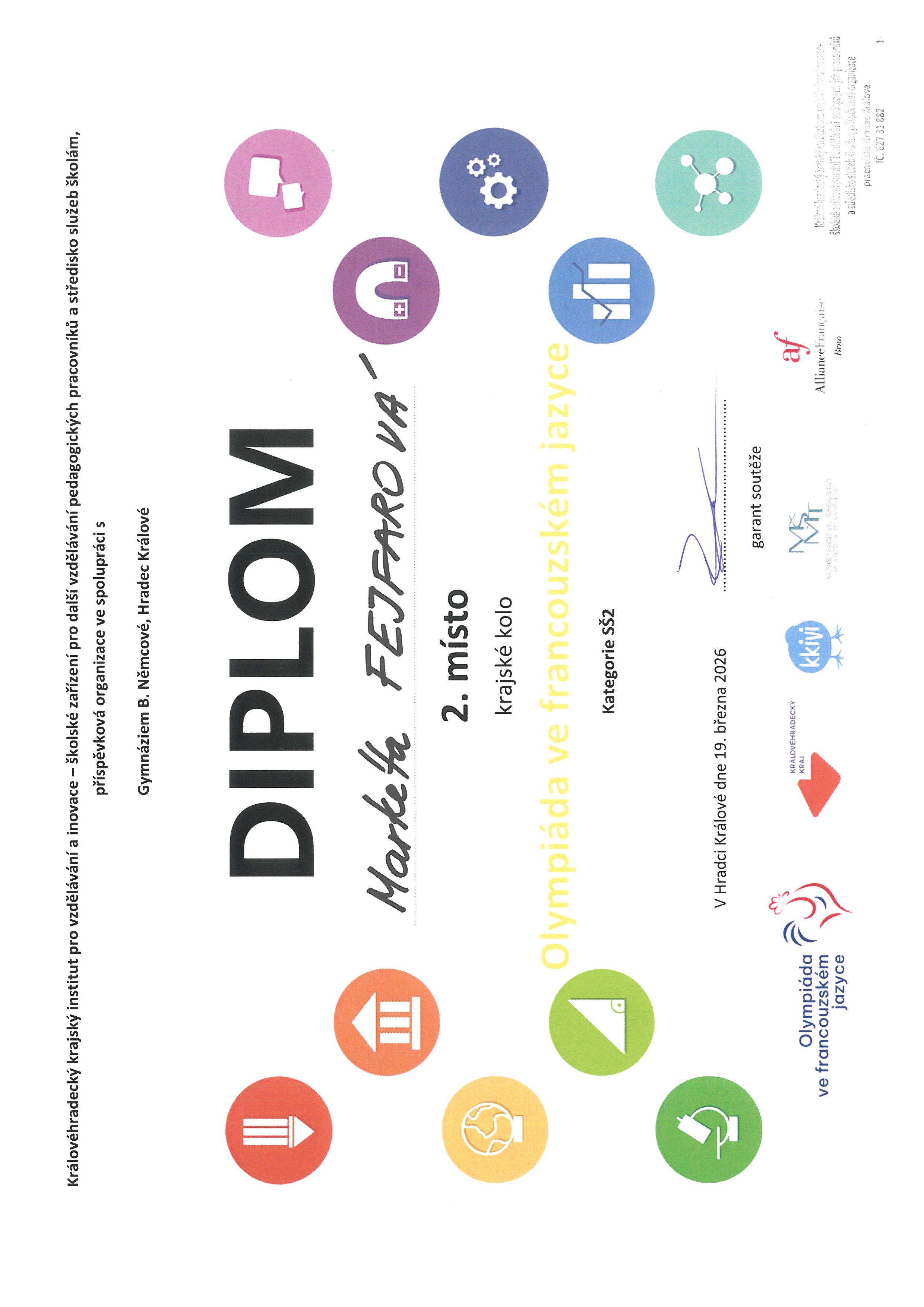 19. března proběhlo na Gymnáziu Boženy Němcové krajské kolo Olympiády ve francouzském jazyce. Markéta Fejfarová ze sexty obsadila ve své kategorii 2. místo. Félicitations!