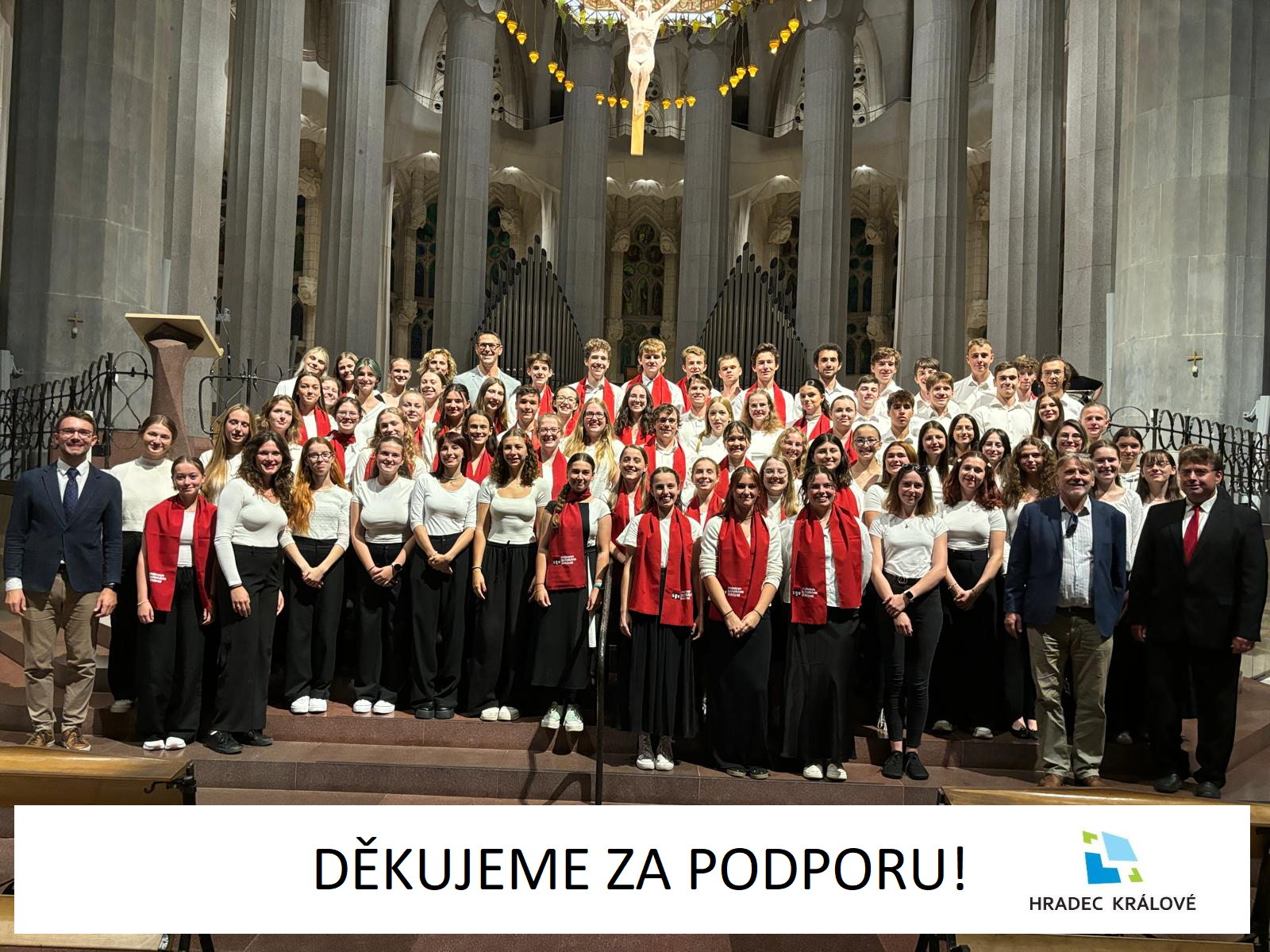 Město Hradec Králové v roce 2024 podpořilo náš projekt: „Účast školního sboru na mezinárodním folklórním festivalu ve Španělsku“ z „Fondu na podporu veřejně prospěšných projektů“. Díky tomuto projektu jsme mohli uskutečnit s podporou města koncertní turné do Španělska, kde jsme zazpívali kromě folklórního festivalu v Lloret de Mar také v Sagradě Familii v Barceloně a cestou ještě v katedrále v Basileji a Štrasburku. Za podporu děkujeme!