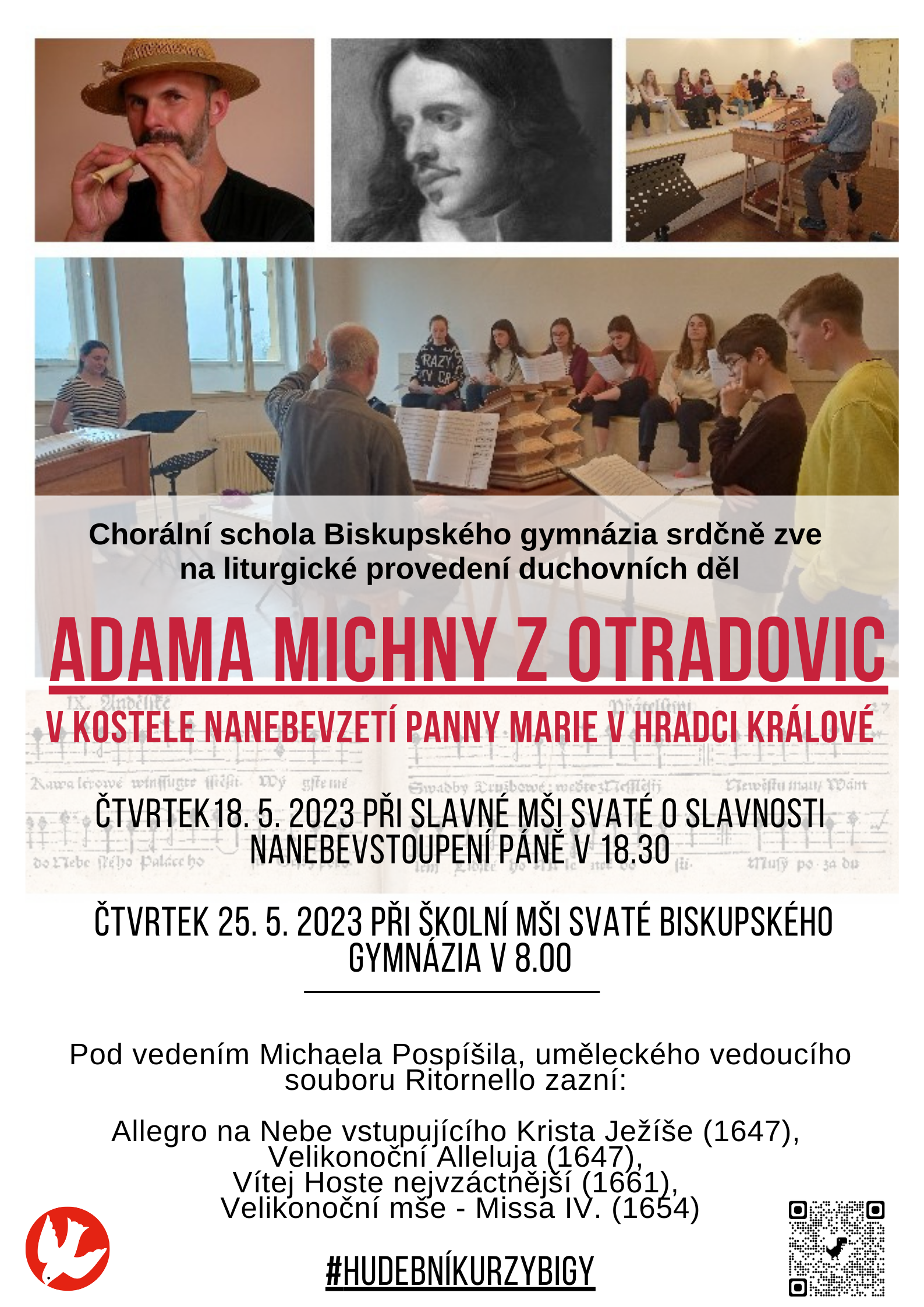 Srdečně zveme na školní mši svatou s doprovodem duchovní hudby Adama Michny z Otradovic tento čtvrtek 25. 5. netradičně od 8 hodin v kostele Nanebevzetí Panny Marie. Jedná se o slavnostní provedení výstupů z kurzů duchovní hudby pod vedením Michaela Pospíšila, vystoupí naše chorální schola.