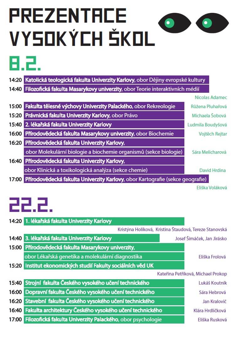 Zveme všechny studenty z řad vyššího gymnázia na prezentaci vysokých škol, kterou si pro ně tradičně připravili naši absolventi. Program viz přiložený plakát.