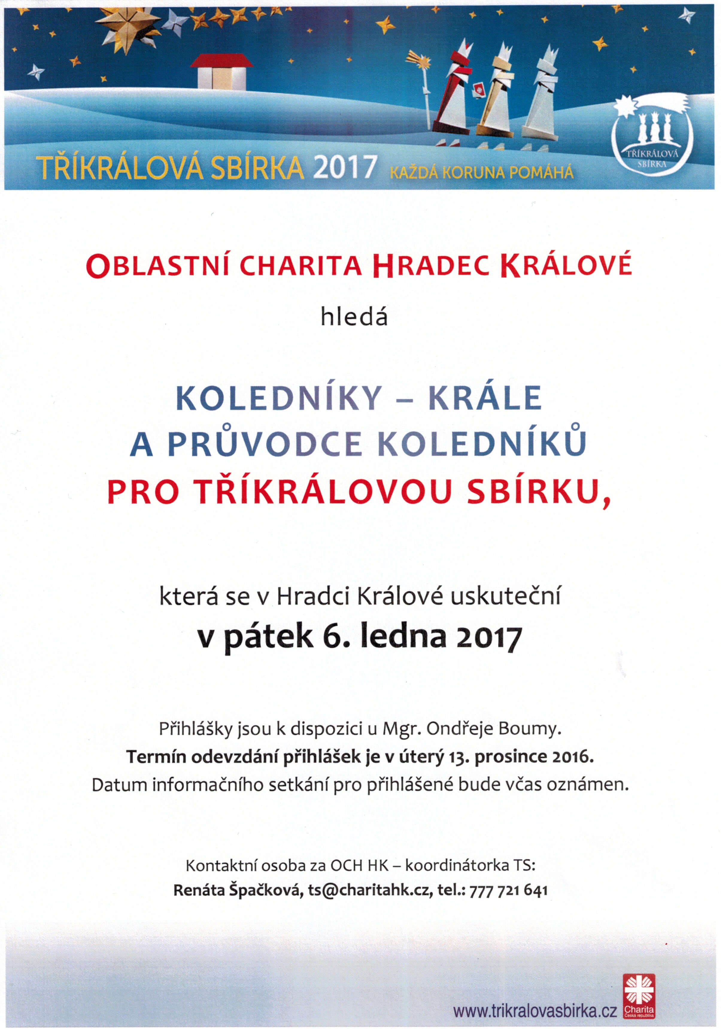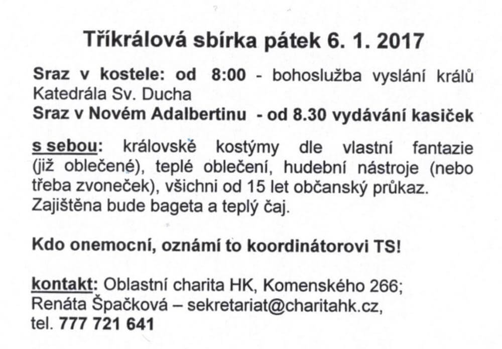 Charita ještě hledá několik průvodců skupinek (starších 15ti let). Pokud byste v novém roce rádi spáchali dobrý skutek napište či zavolejte koordinátorce sbírky Renátě Špačkové (ts [at] charitahk.cz (ts[at]charitahk[dot]cz), 777 721 641).