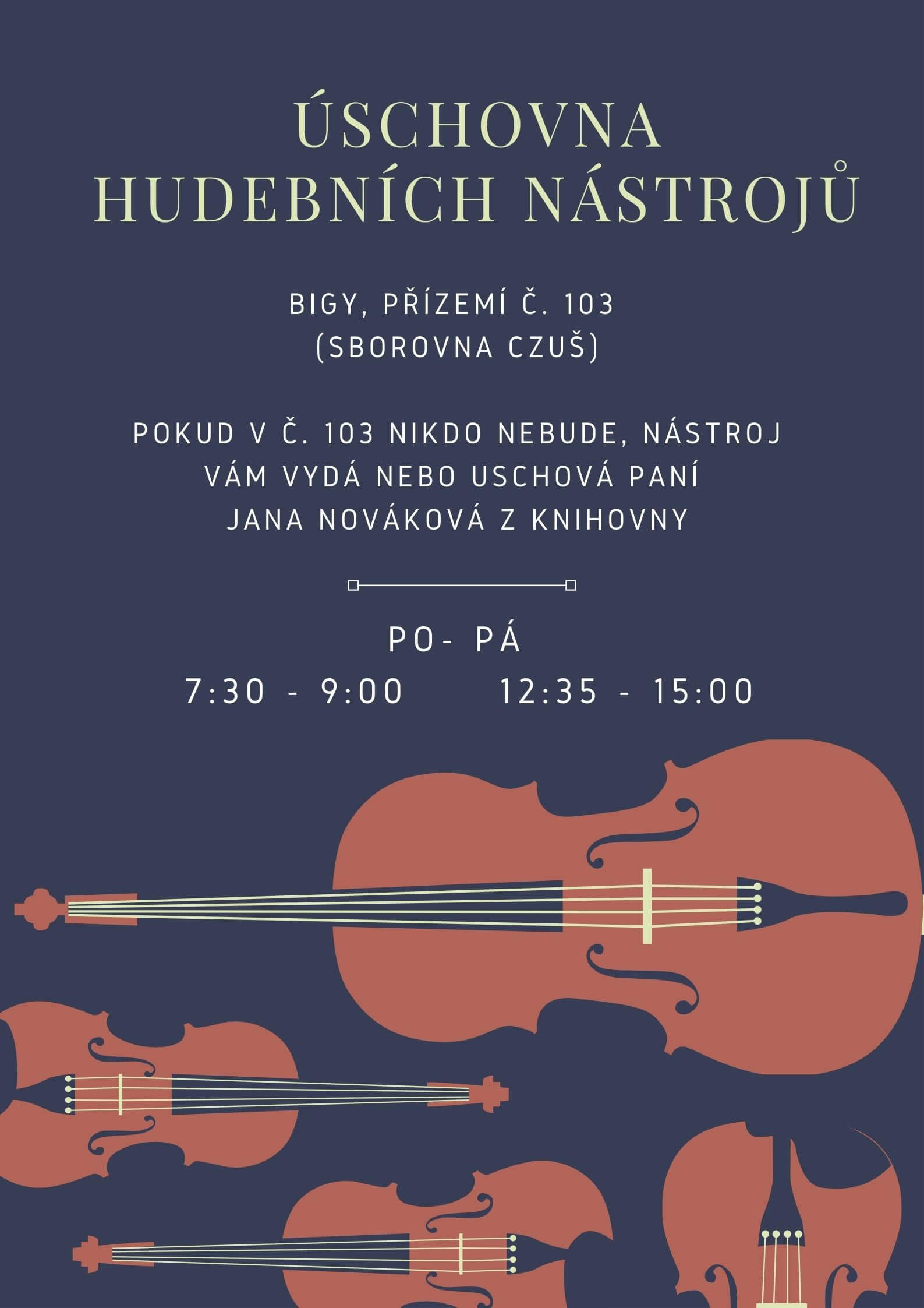 Od pondělí 13. 9. je na BiGy v provozu úschovna hudebních nástrojů, která bude studentům sloužit po dobu výuky nebo oběda. Bližší informace u učitelů HV, v knihovně nebo ve sborovně CZUŠ (č. 103).