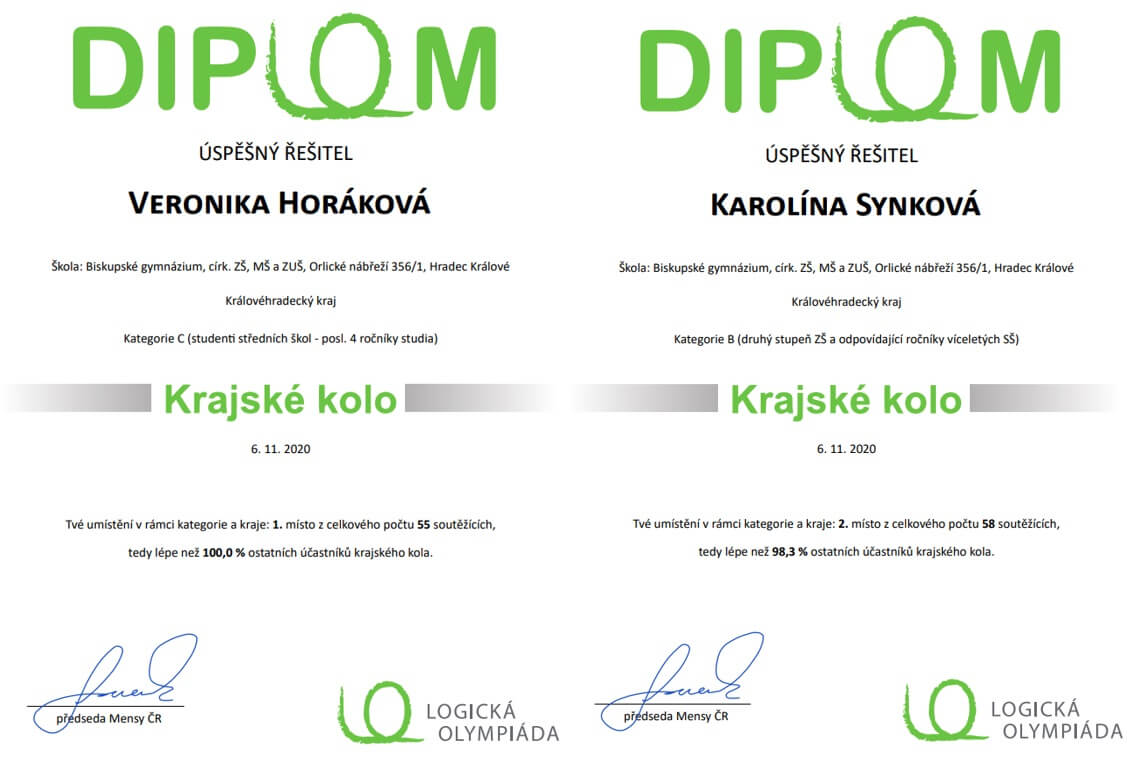 Gratulujeme našim studentkám ke skvělým umístěním v krajském kole Logické olympiády. Veronika Horáková obsadila 1. místo a Karolína Synková 2. místo ve svých kategoriích!