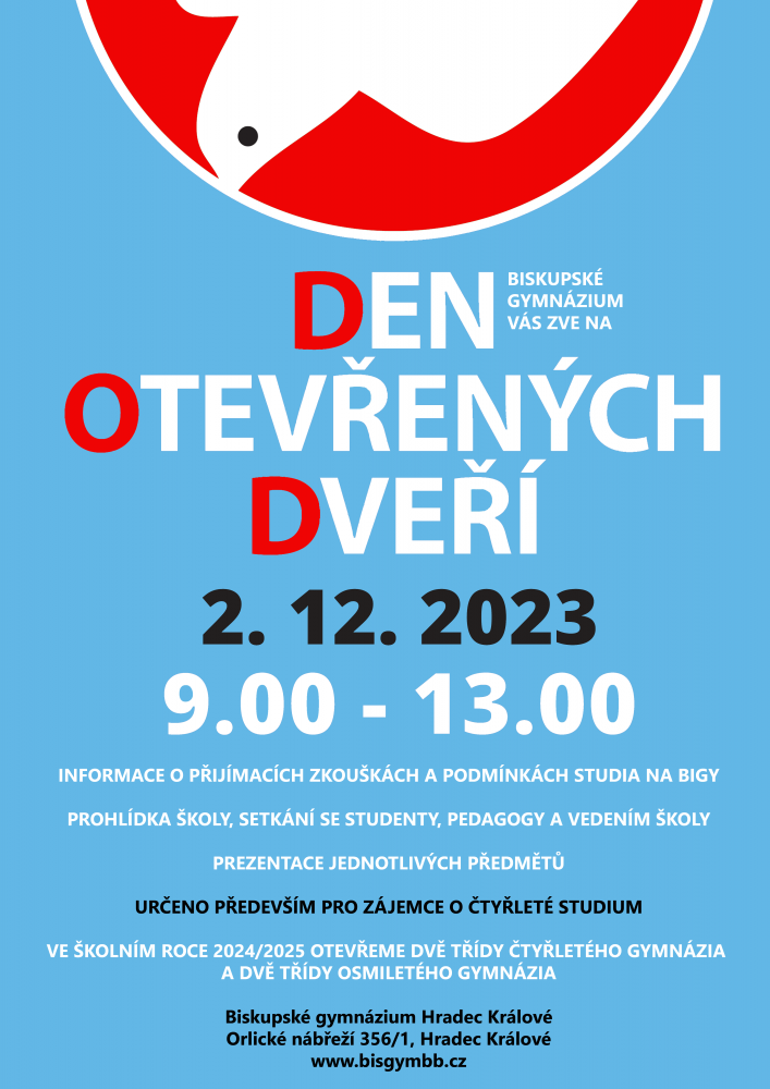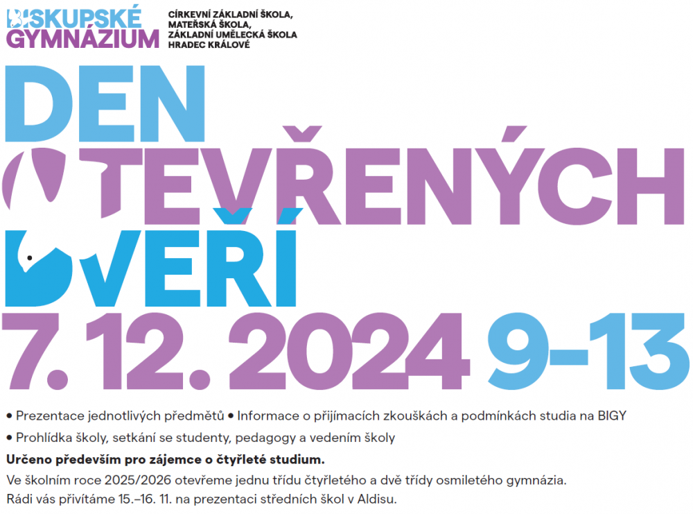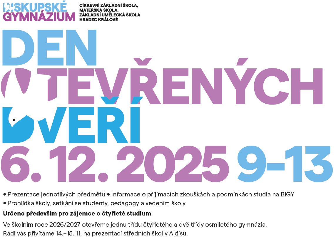 Těšíme se na všechny zájemce o 4leté studium na našem gymnáziu již tuto sobotu 6. 12. v prostorách BIGY! Prezentace vedení s informacemi o škole a přijímacích zkouškách jsou naplánovány na 9:30 a 11:00.